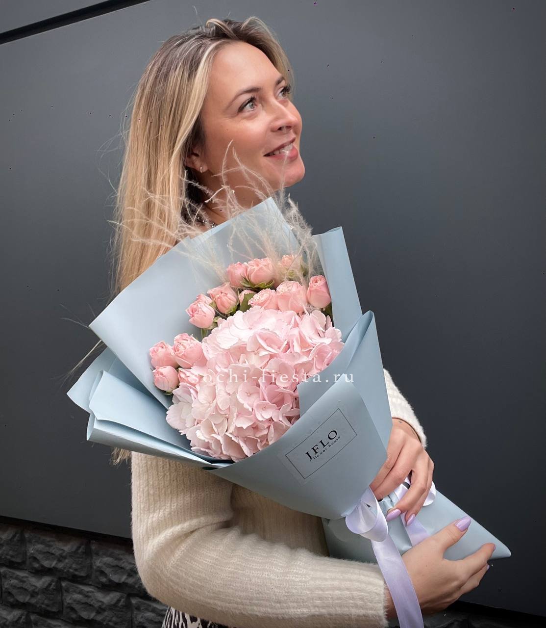 Девятнадцать бутонов раскрываются плавными волнами, создавая объёмную композицию с чёткими линиями. Розовый оттенок переходит от светлого к насыщенному, а эвкалипт добавляет воздушности между соцветиями. Букет держит форму и выглядит самодостаточно.