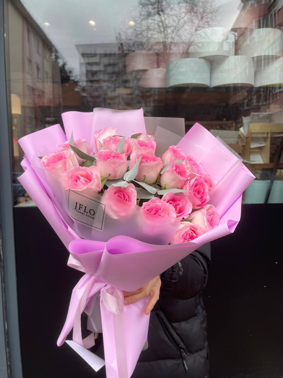 Семь розовых бутонов с ветками эвкалипта в лаконичной подаче. Компактная форма удобна для размещения на столе или полке. Зелень освежает и дополняет цветовую гамму.