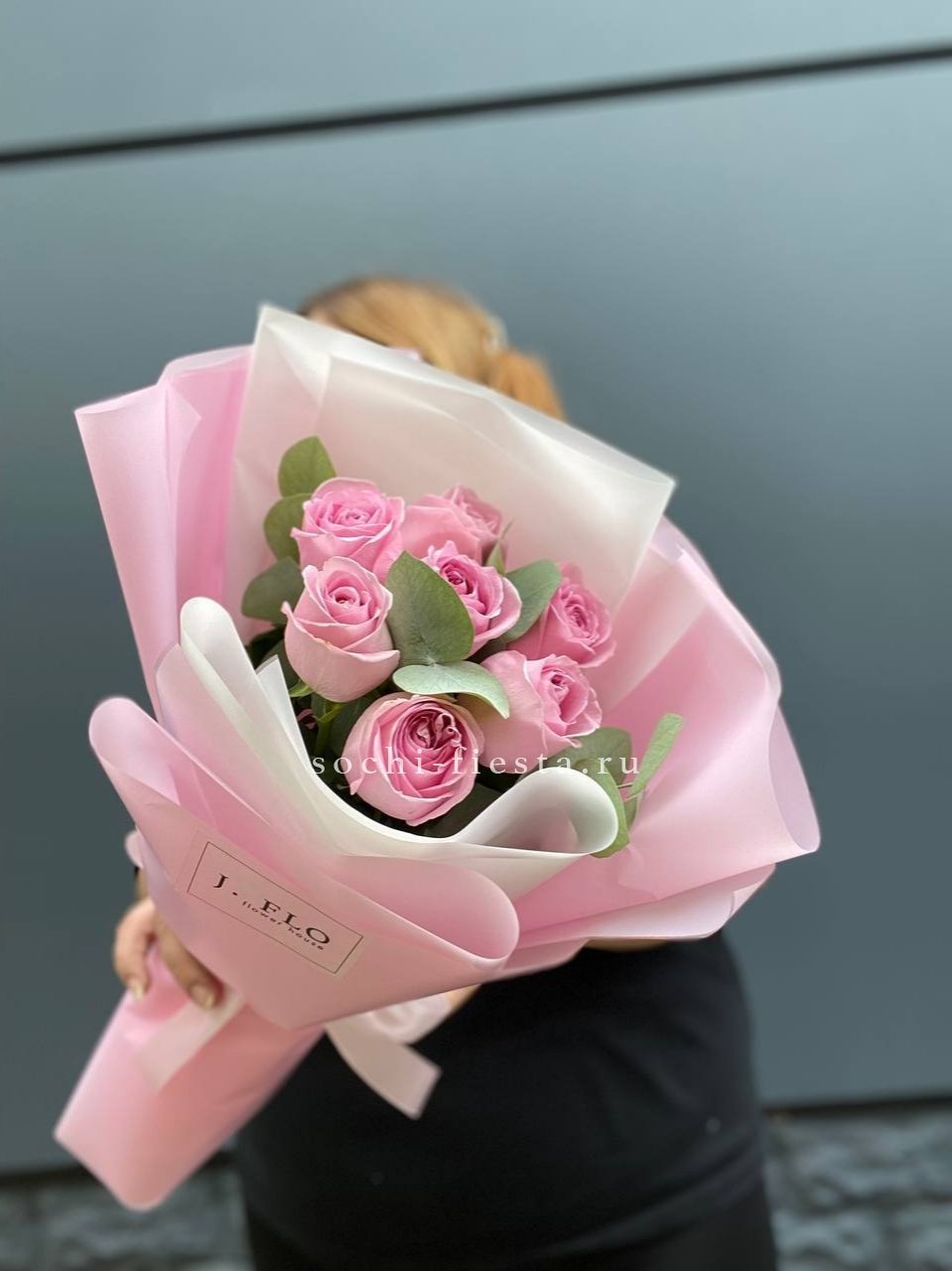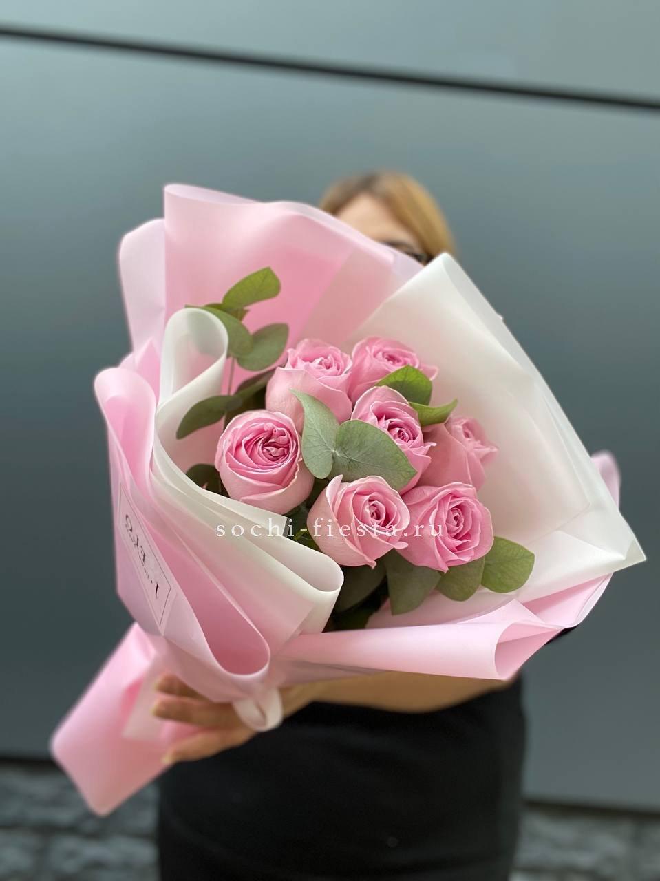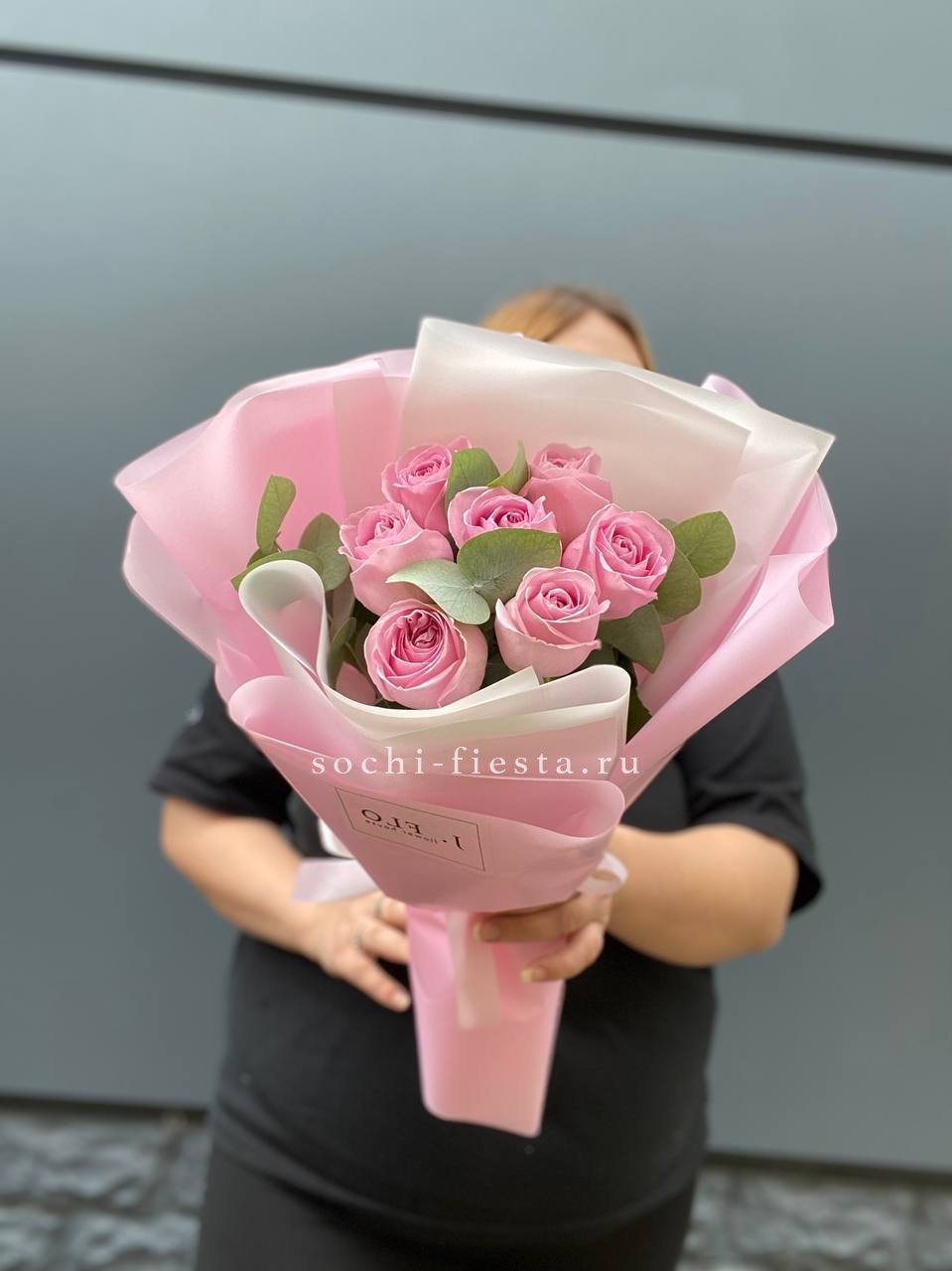 Для заказа товара "7 розовых роз с эвкалиптом" с доставкой в Долгопрудном нажмите