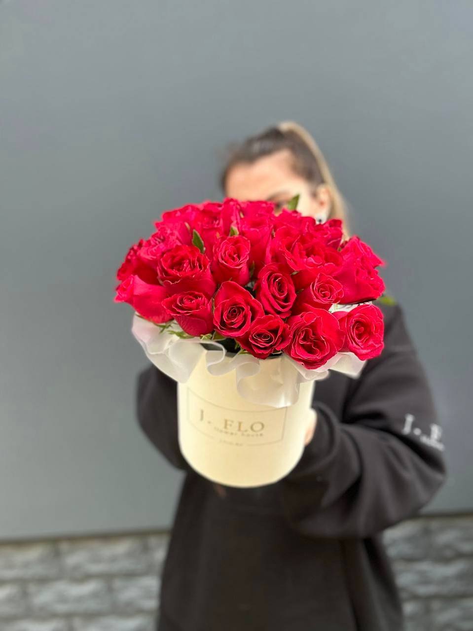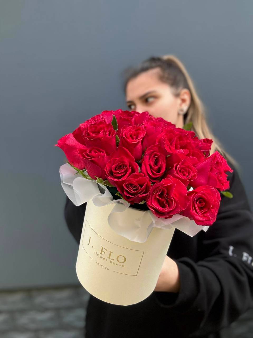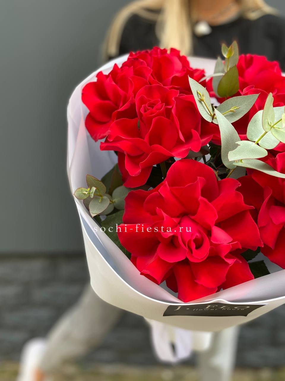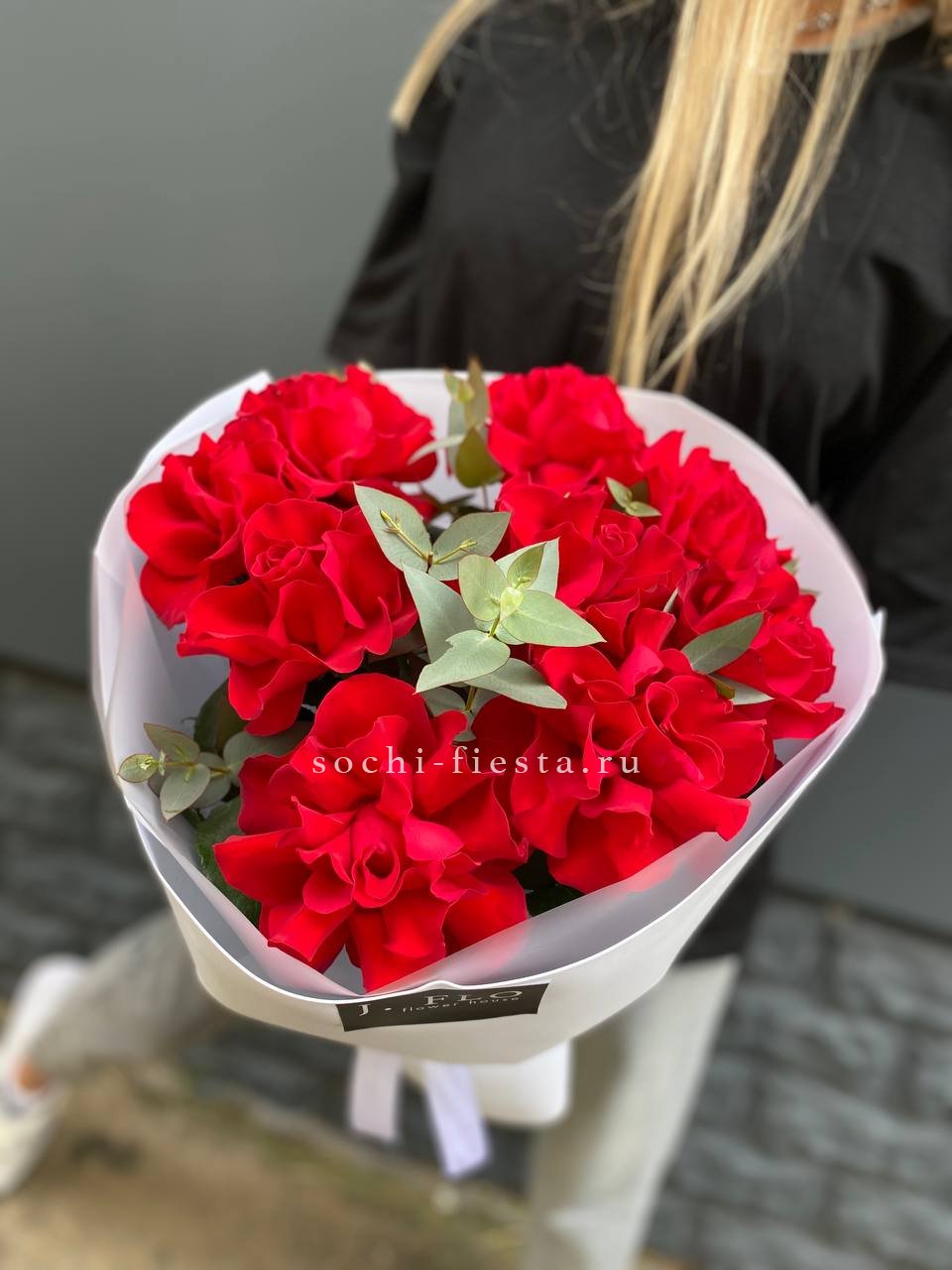 Пятнадцать красных роз на длинных стеблях выглядят графично и выразительно. Насыщенный оттенок лепестков держит внимание и создает яркий акцент. Букет с характером и уверенной подачей.