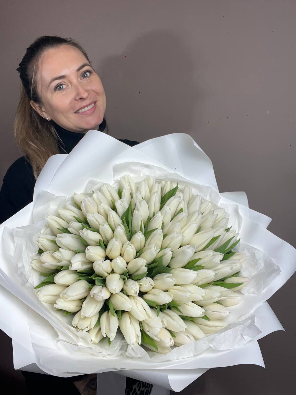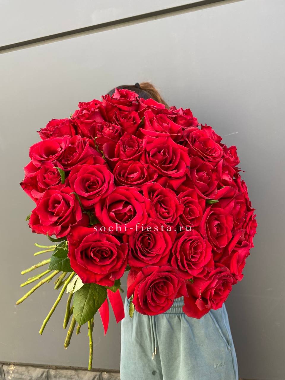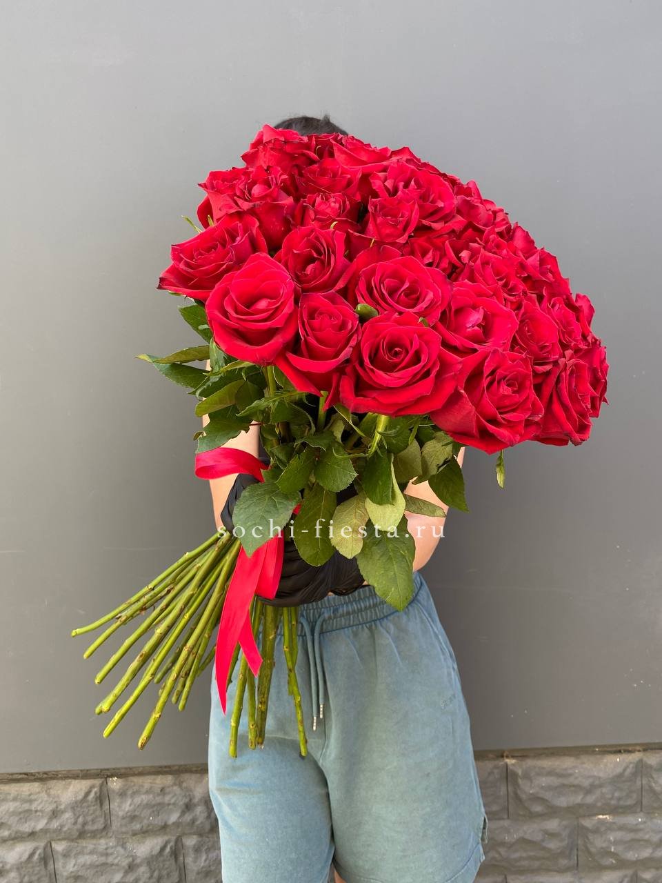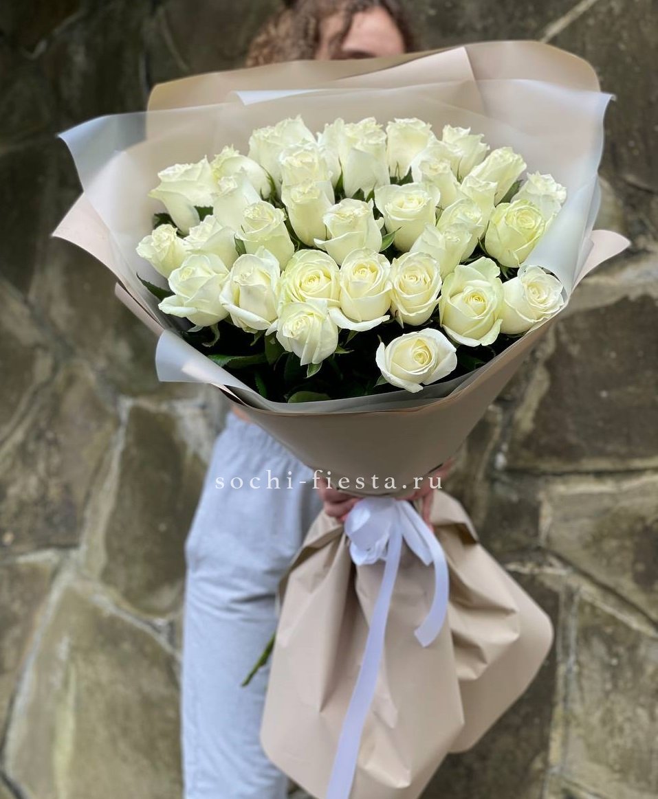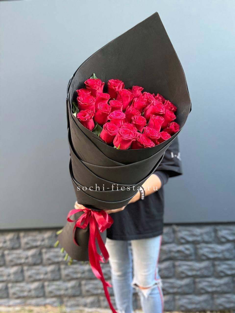 Двадцать пять стеблей выстроены в объёмную композицию с выразительным присутствием. Авторское оформление добавляет завершённость и подчёркивает масштаб букета.
