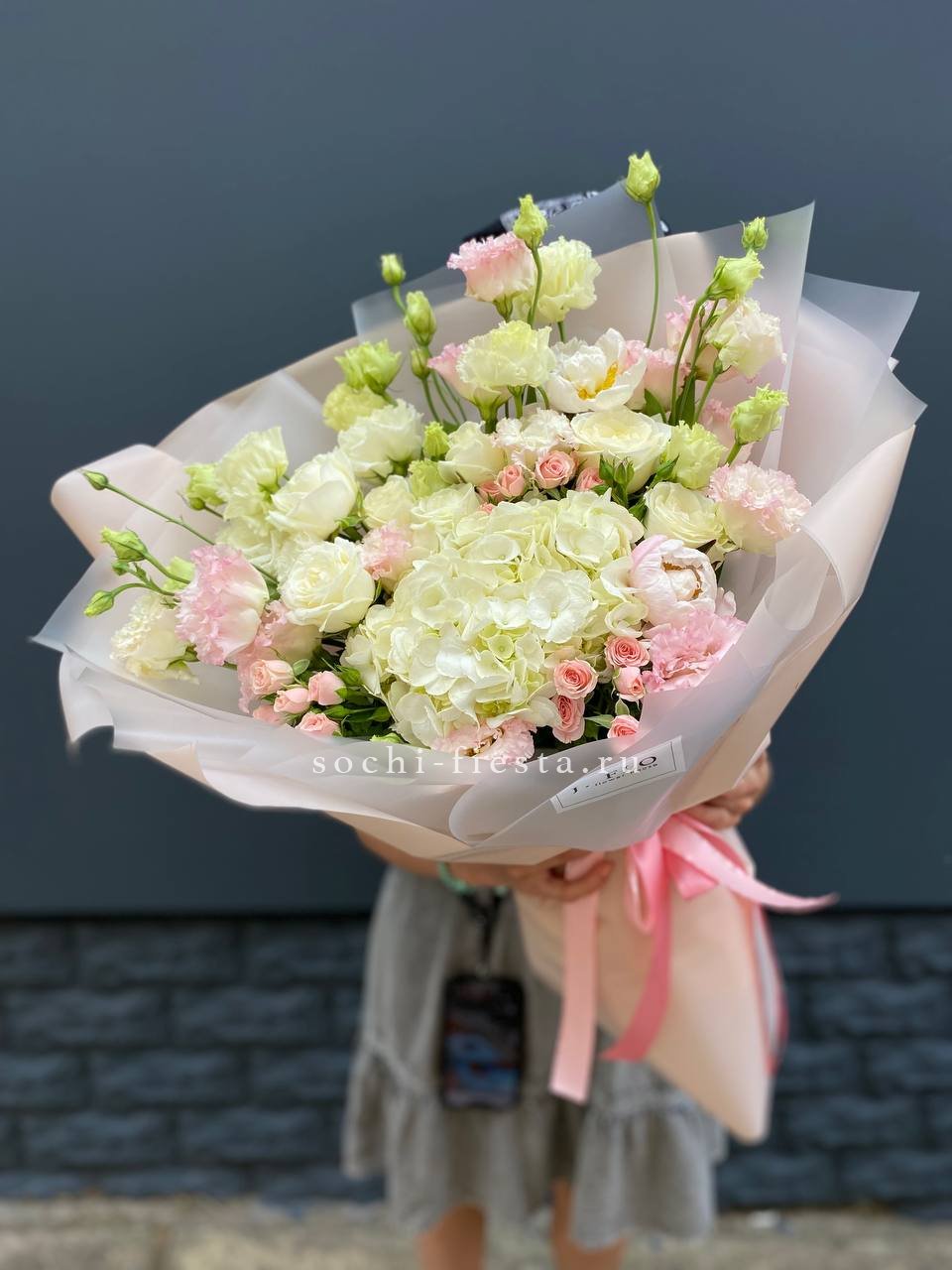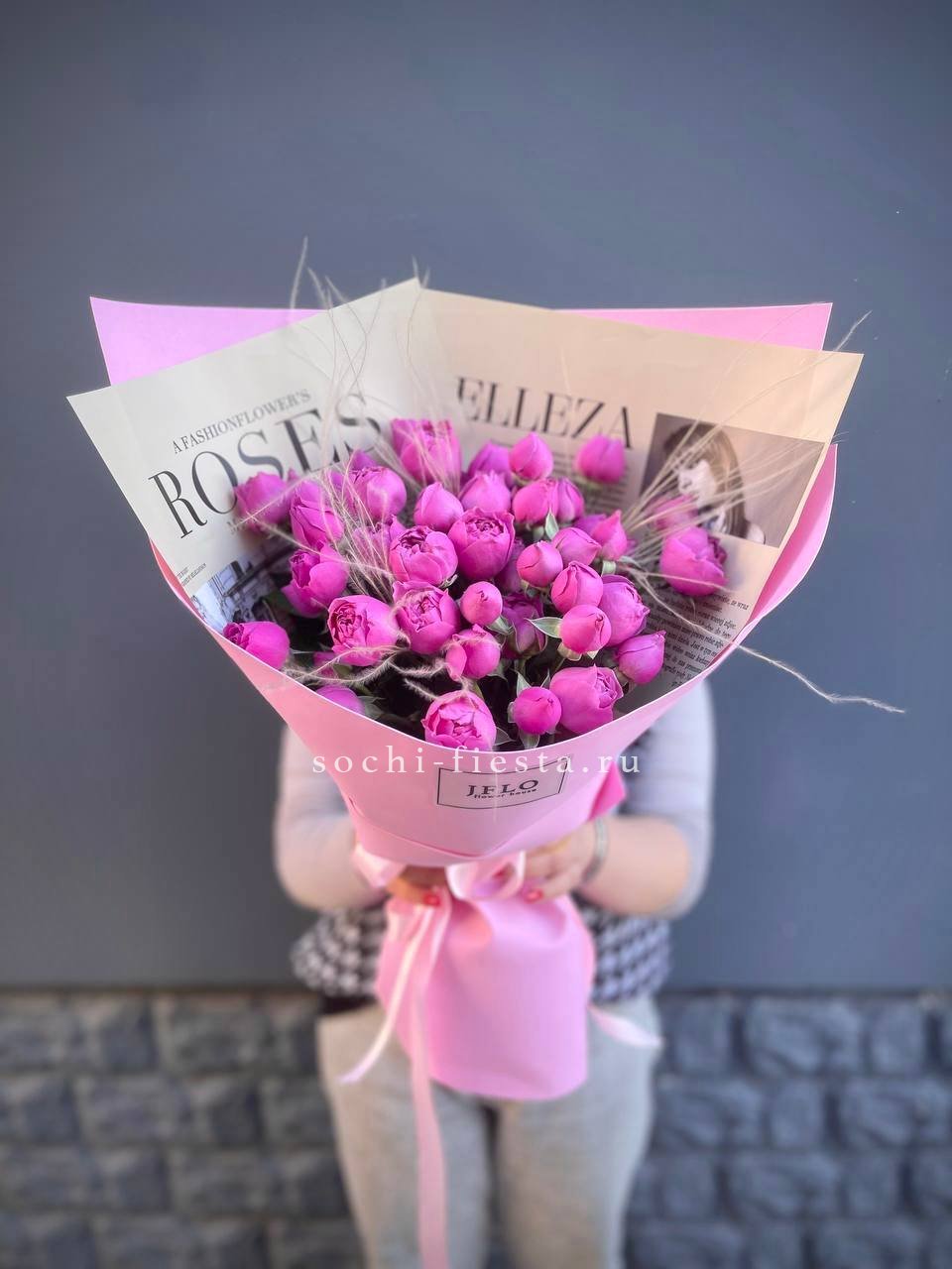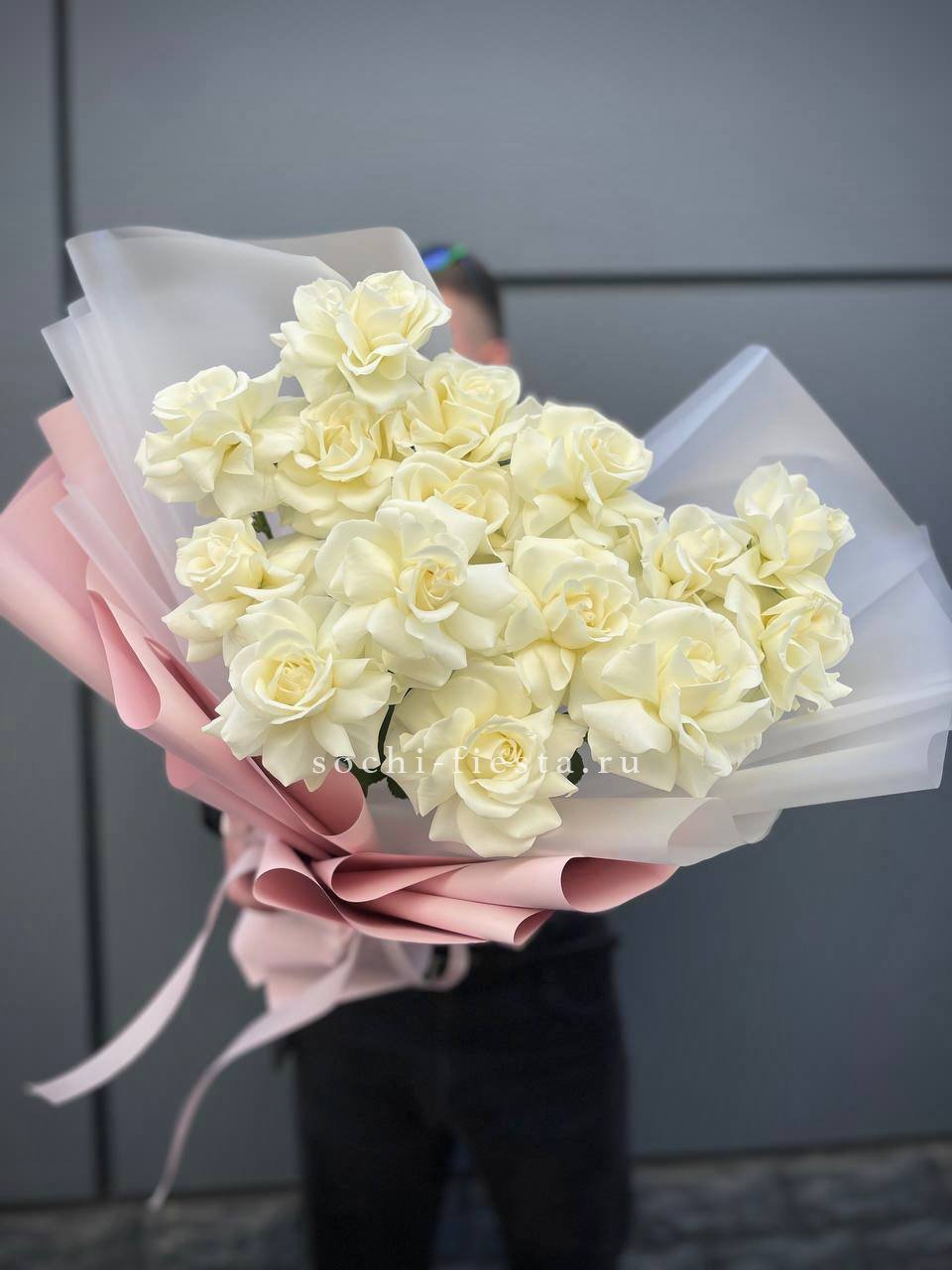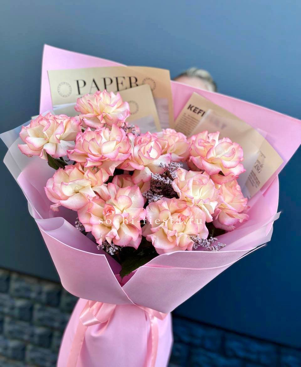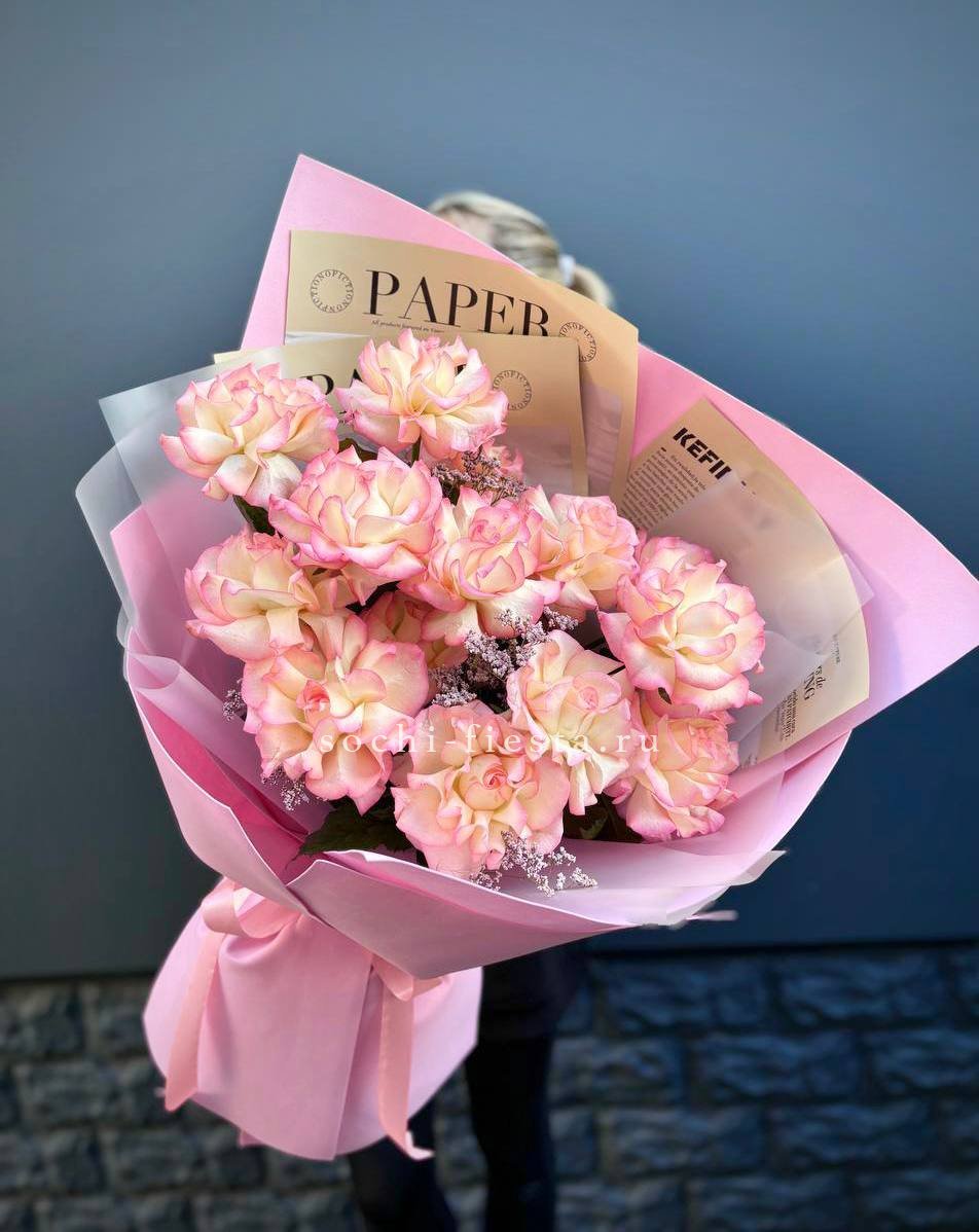 Пятнадцать пионовидных роз дополнены воздушным ковылём в минималистичном оформлении. Текстура густомахровых бутонов раскрывается слоями кремово-розовых лепестков с бежевым отливом.