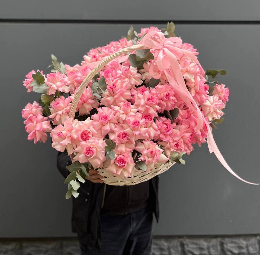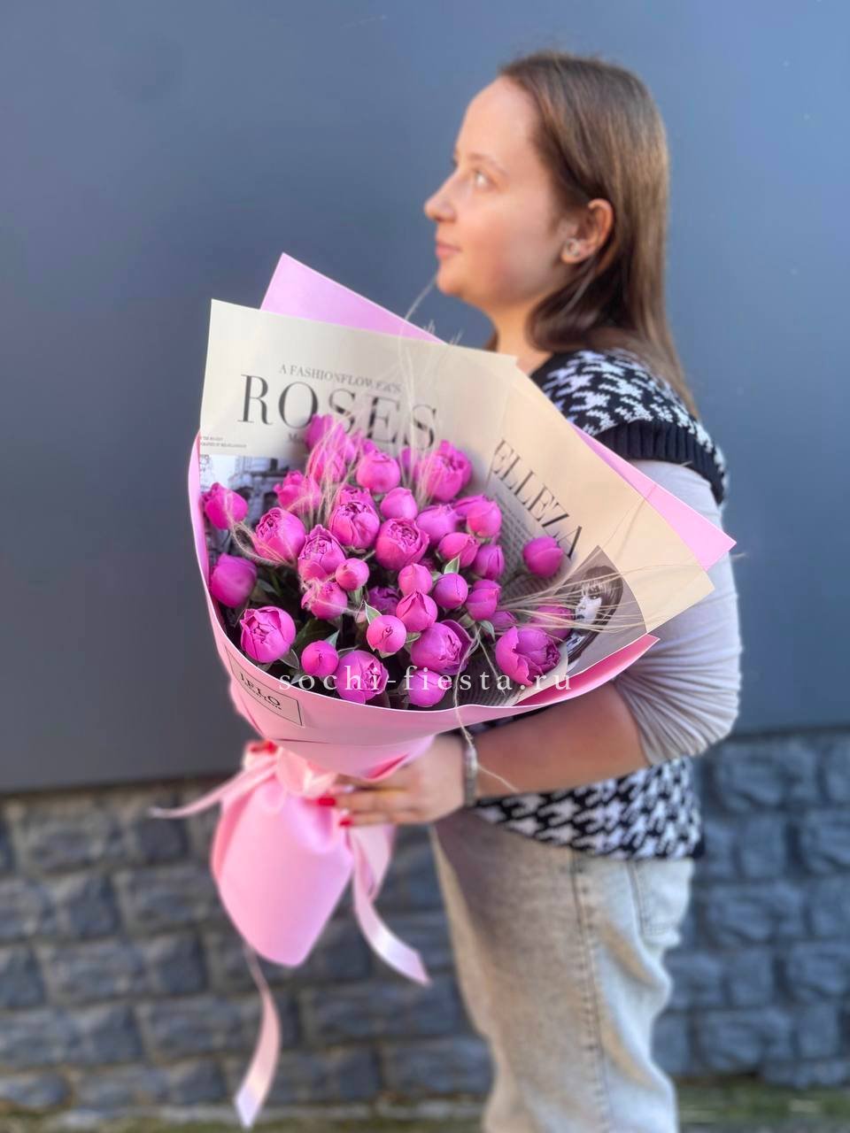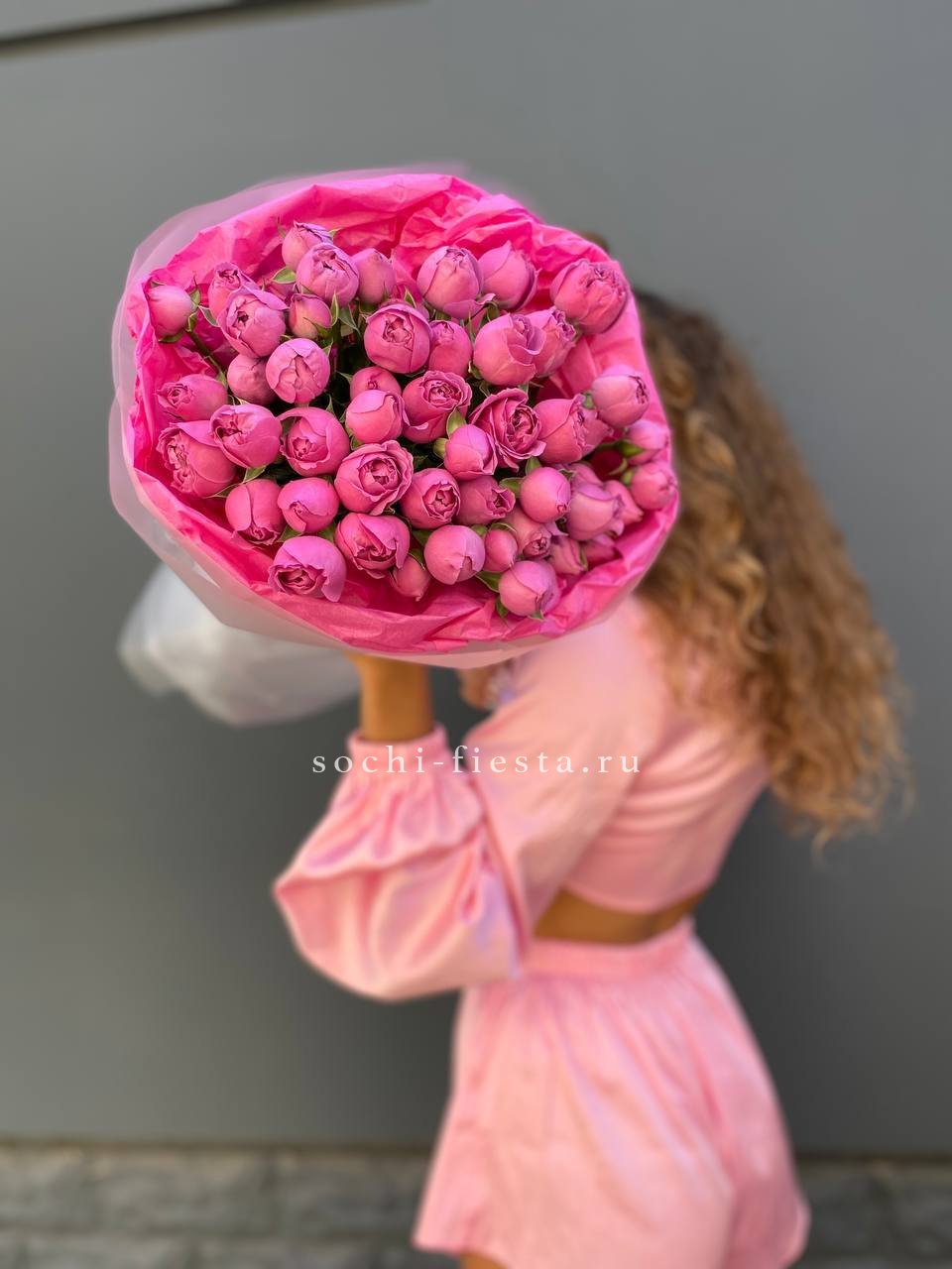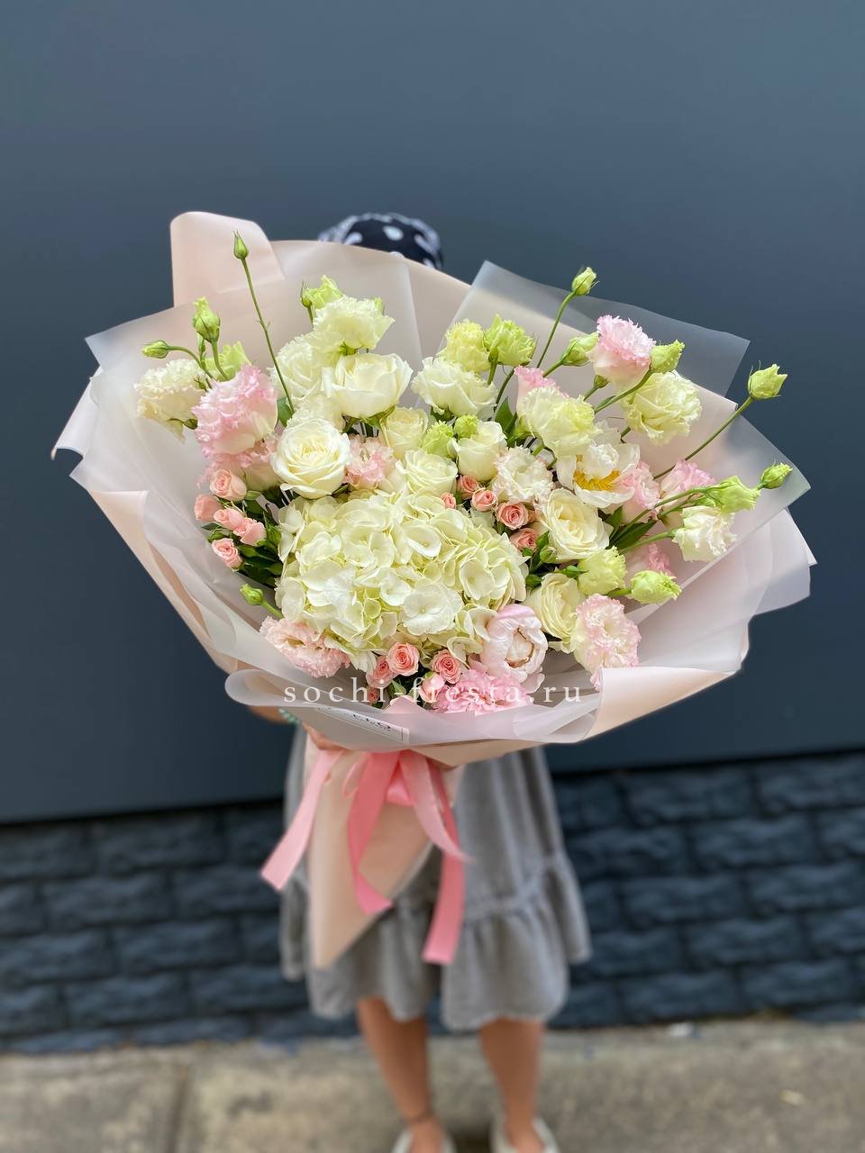 Пятнадцать пионовидных роз дополнены воздушным ковылём в минималистичном оформлении. Текстура густомахровых бутонов раскрывается слоями кремово-розовых лепестков с бежевым отливом.