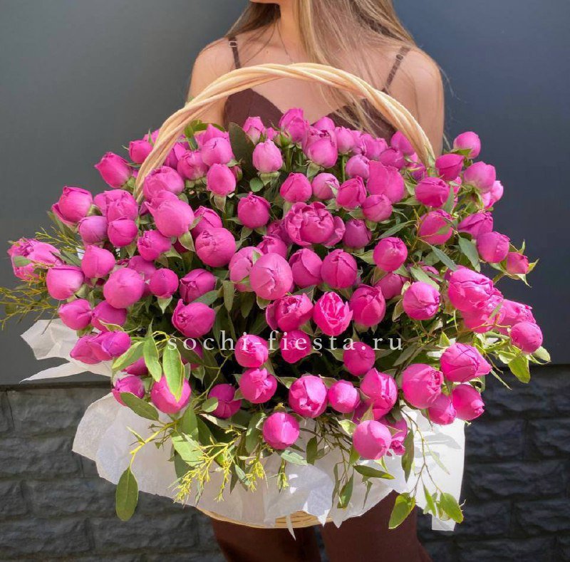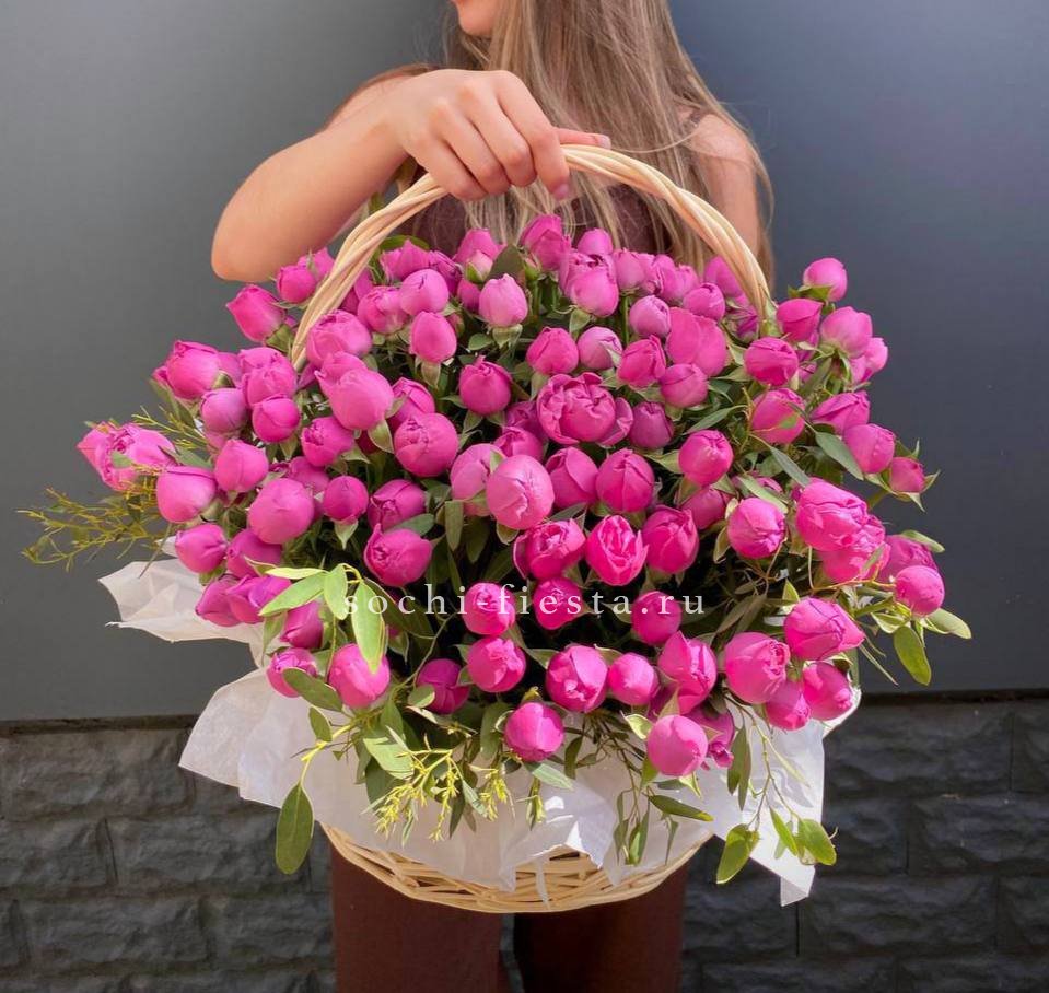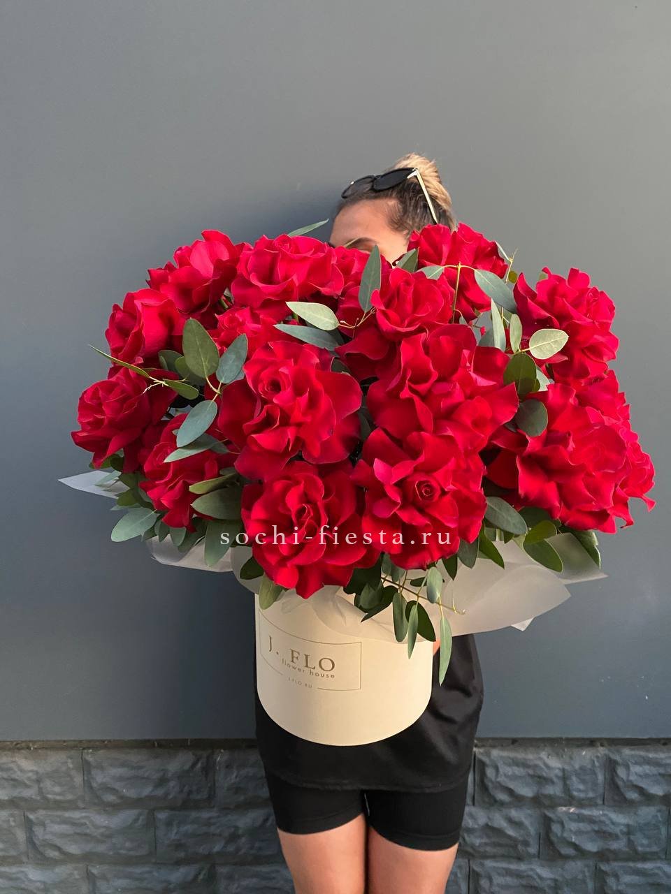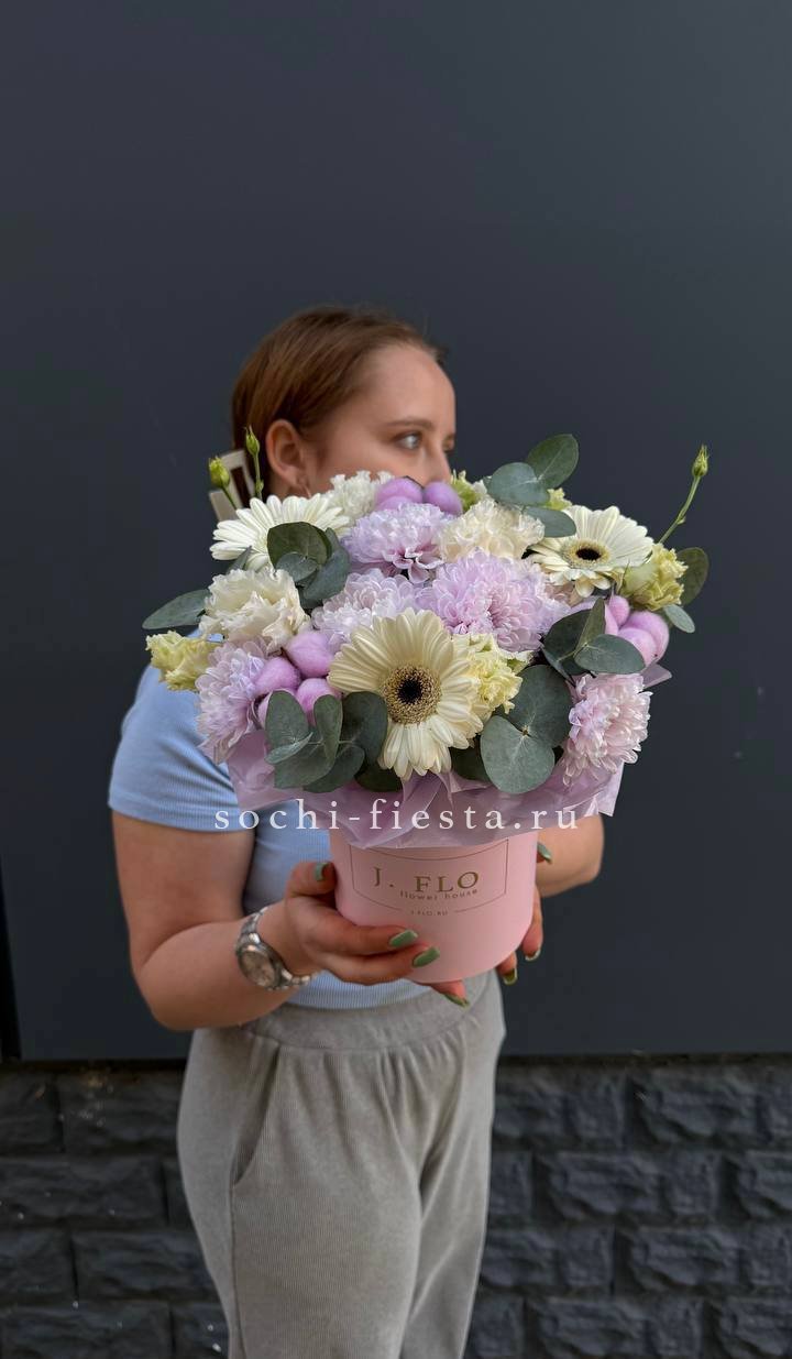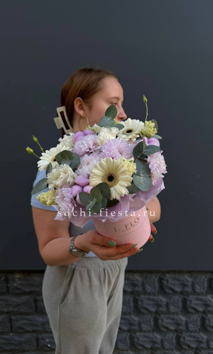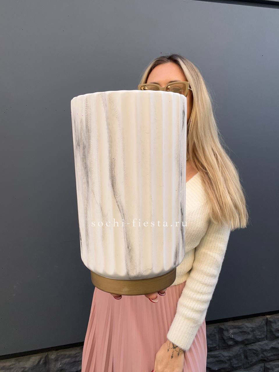 Пятнадцать пионовидных роз дополнены воздушным ковылём в минималистичном оформлении. Текстура густомахровых бутонов раскрывается слоями кремово-розовых лепестков с бежевым отливом.