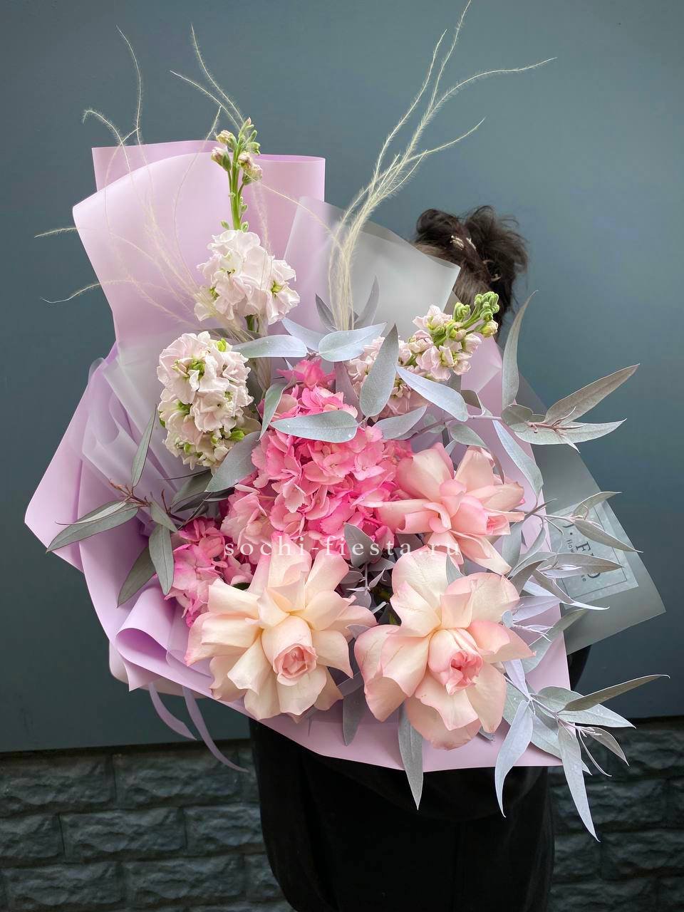 Герберы задают открытый характер букета, розы добавляют мягкости, а гортензия наполняет объёмом. Композиция смотрится свежо и держит форму без усилий.
