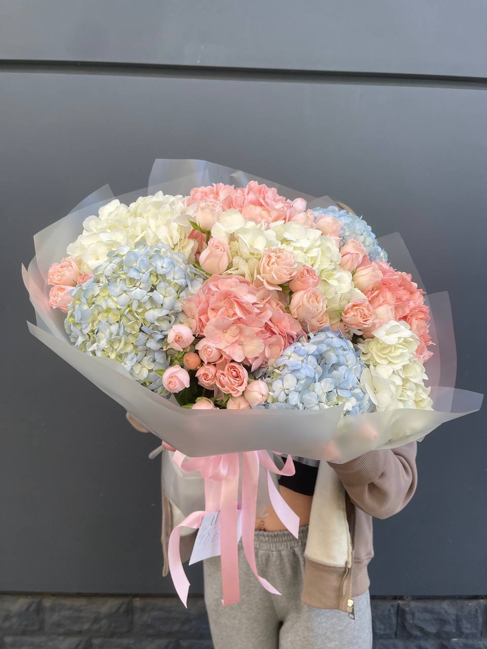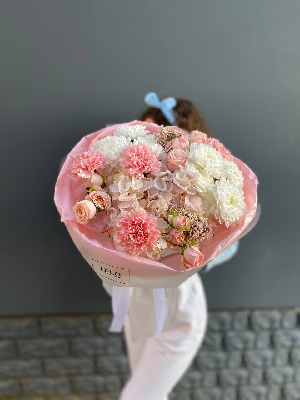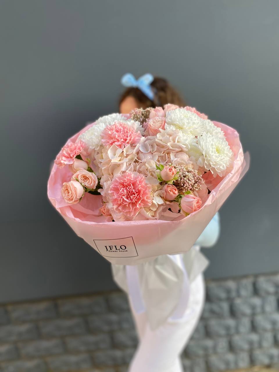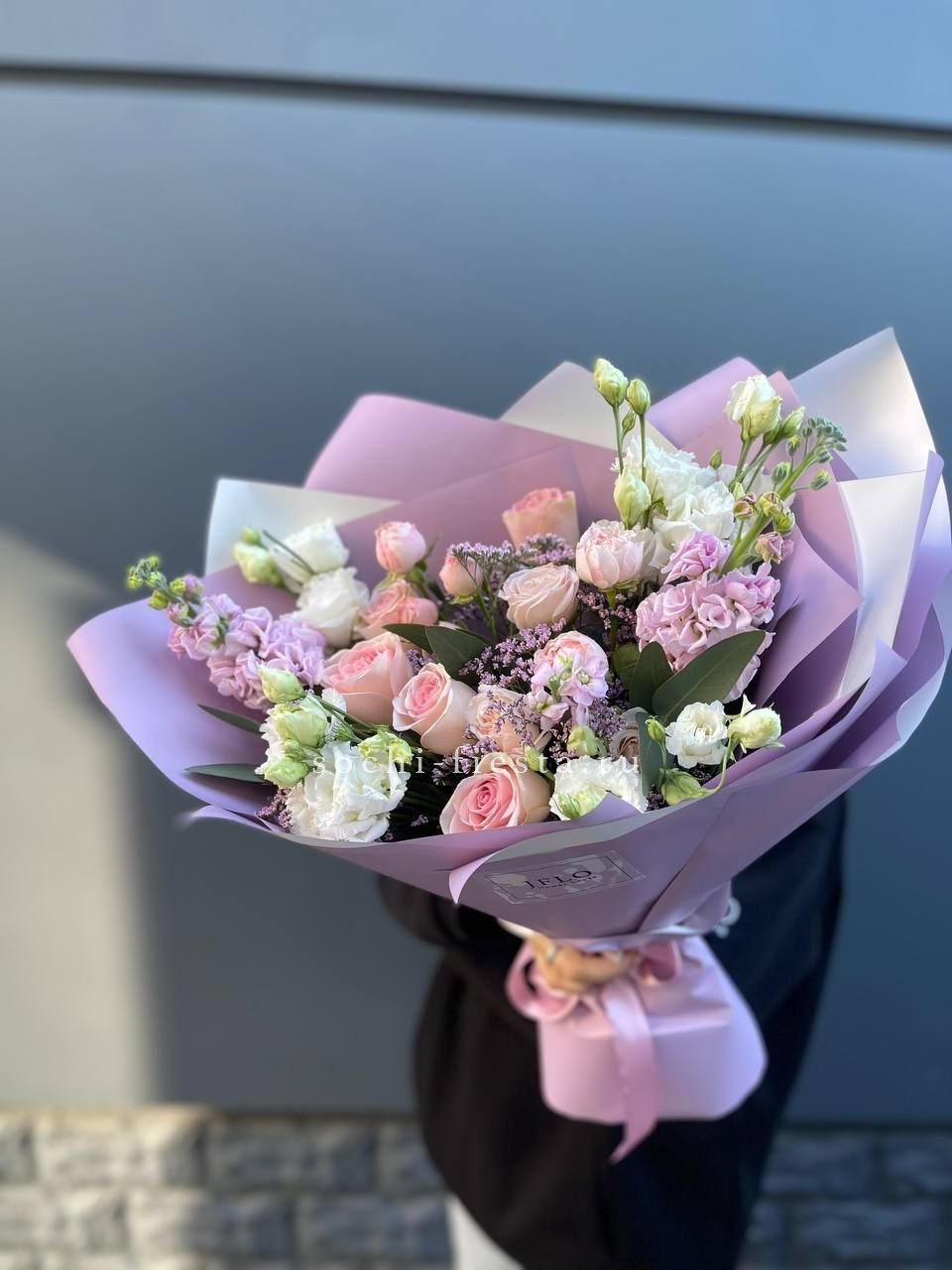 Французские розы и кустовые хризантемы собраны в букет с плотной текстурой и мягким переходом оттенков. Композиция держит форму и долго сохраняет свежесть.