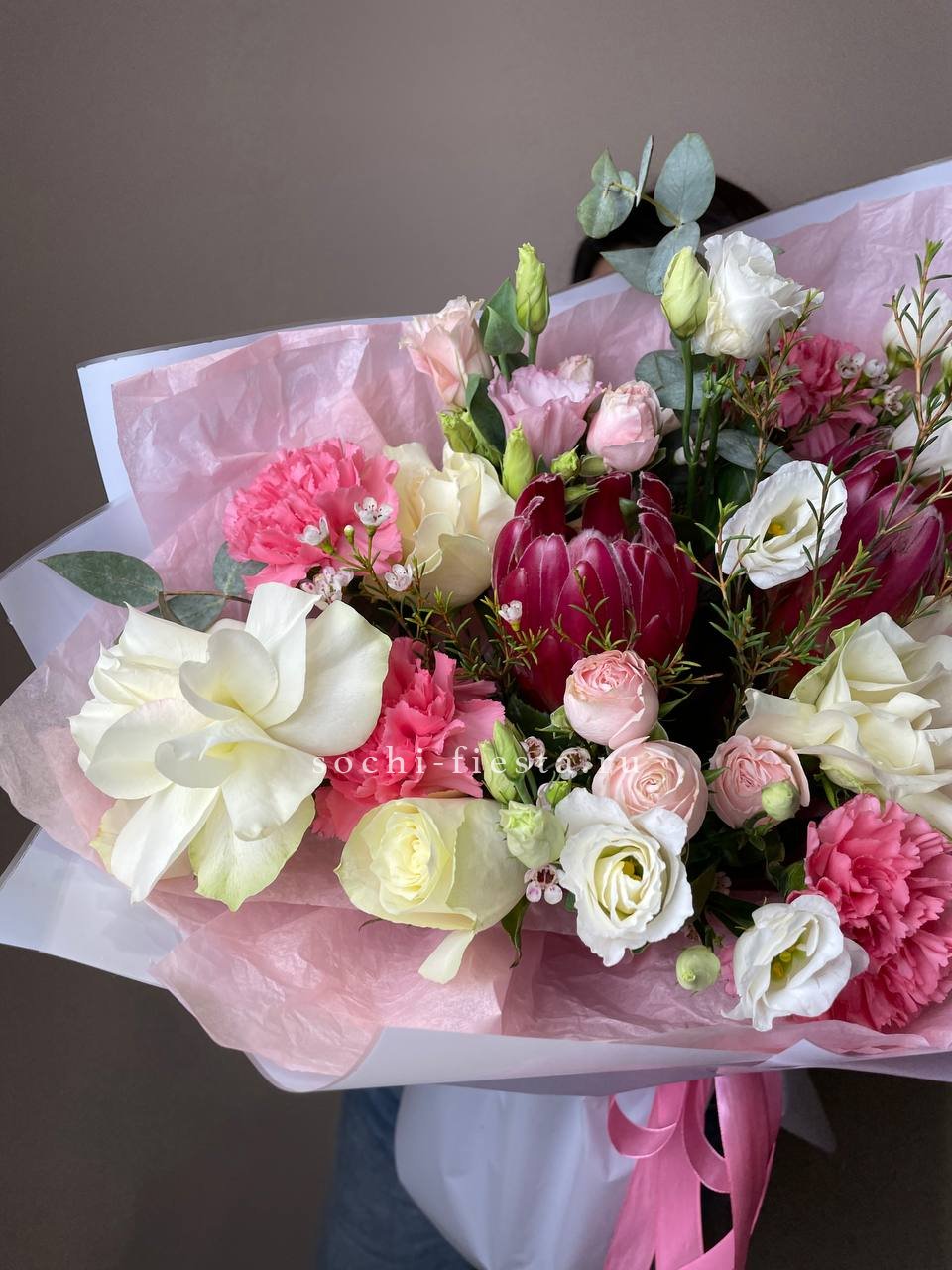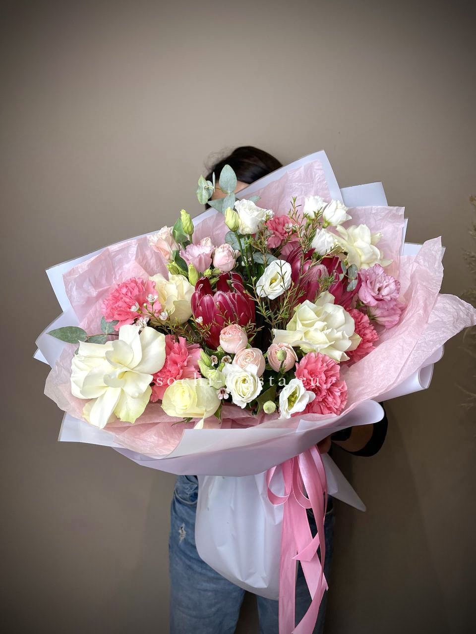 гортензия, хризантема, хамелациум, гербера, мисти баблс, диантус, пленка.