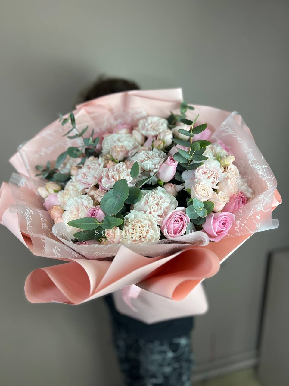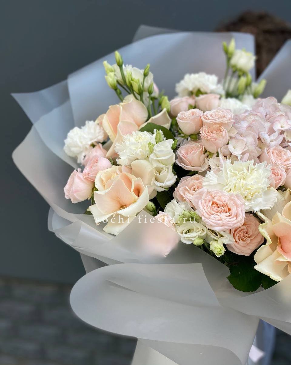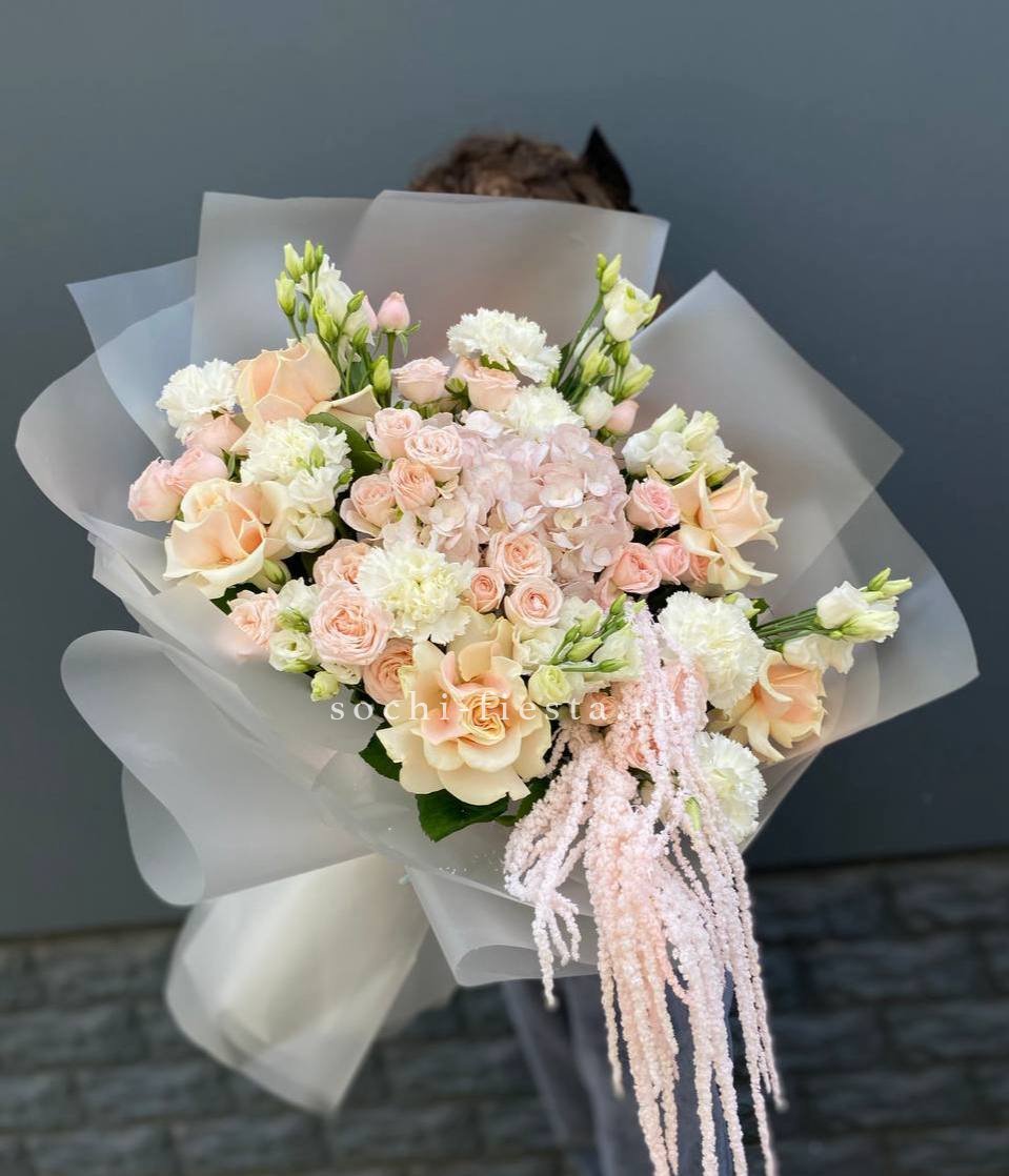 Пышные розы и бомбастик образуют округлую форму с мягкими переходами. Диантус заполняет промежутки между крупными бутонами, а эвкалипт добавляет воздушности композиции.