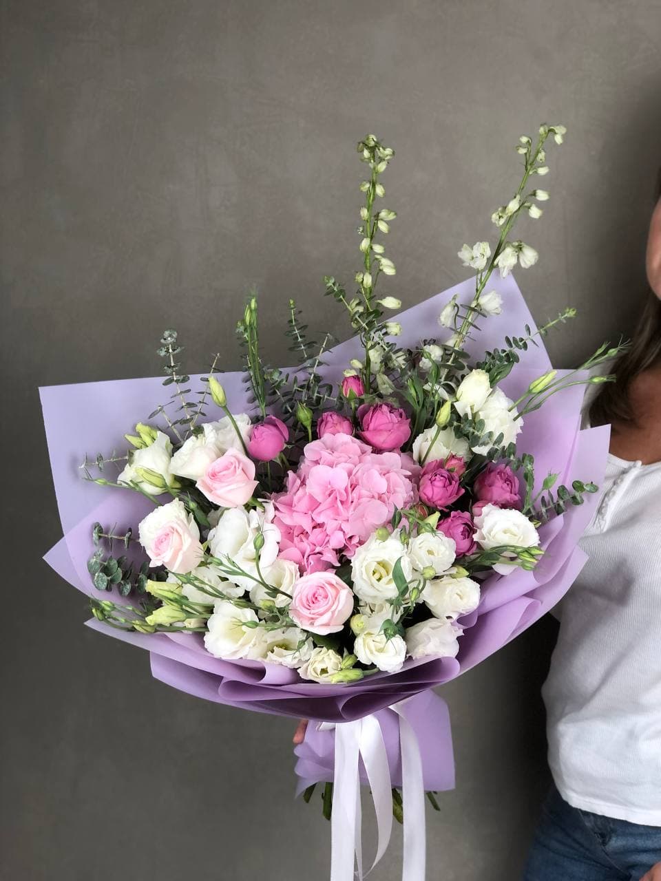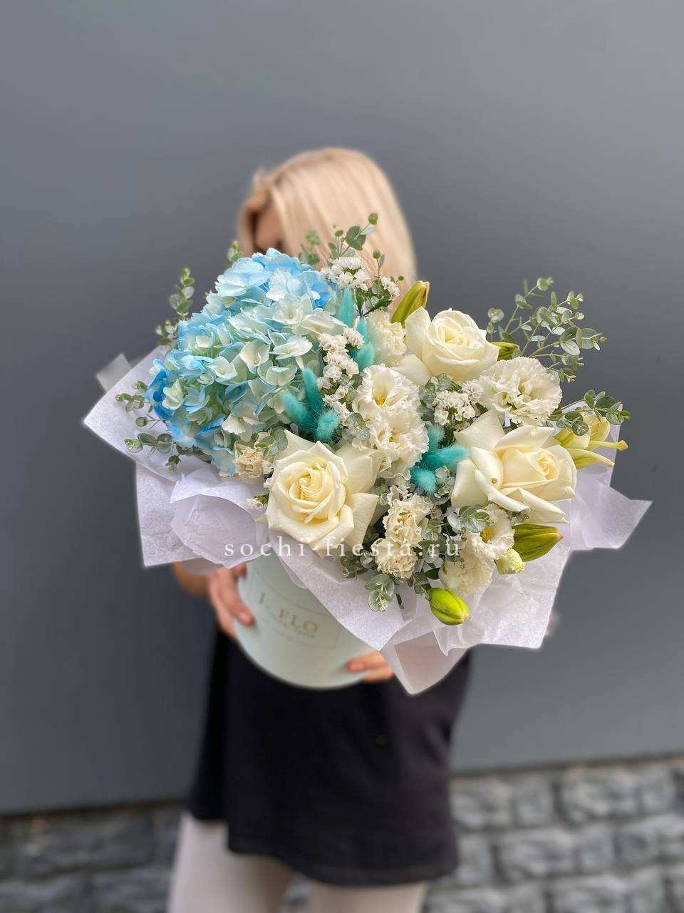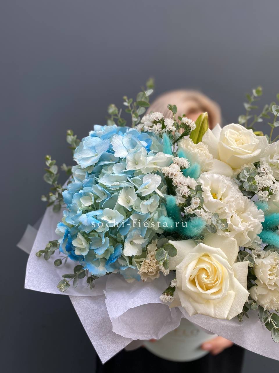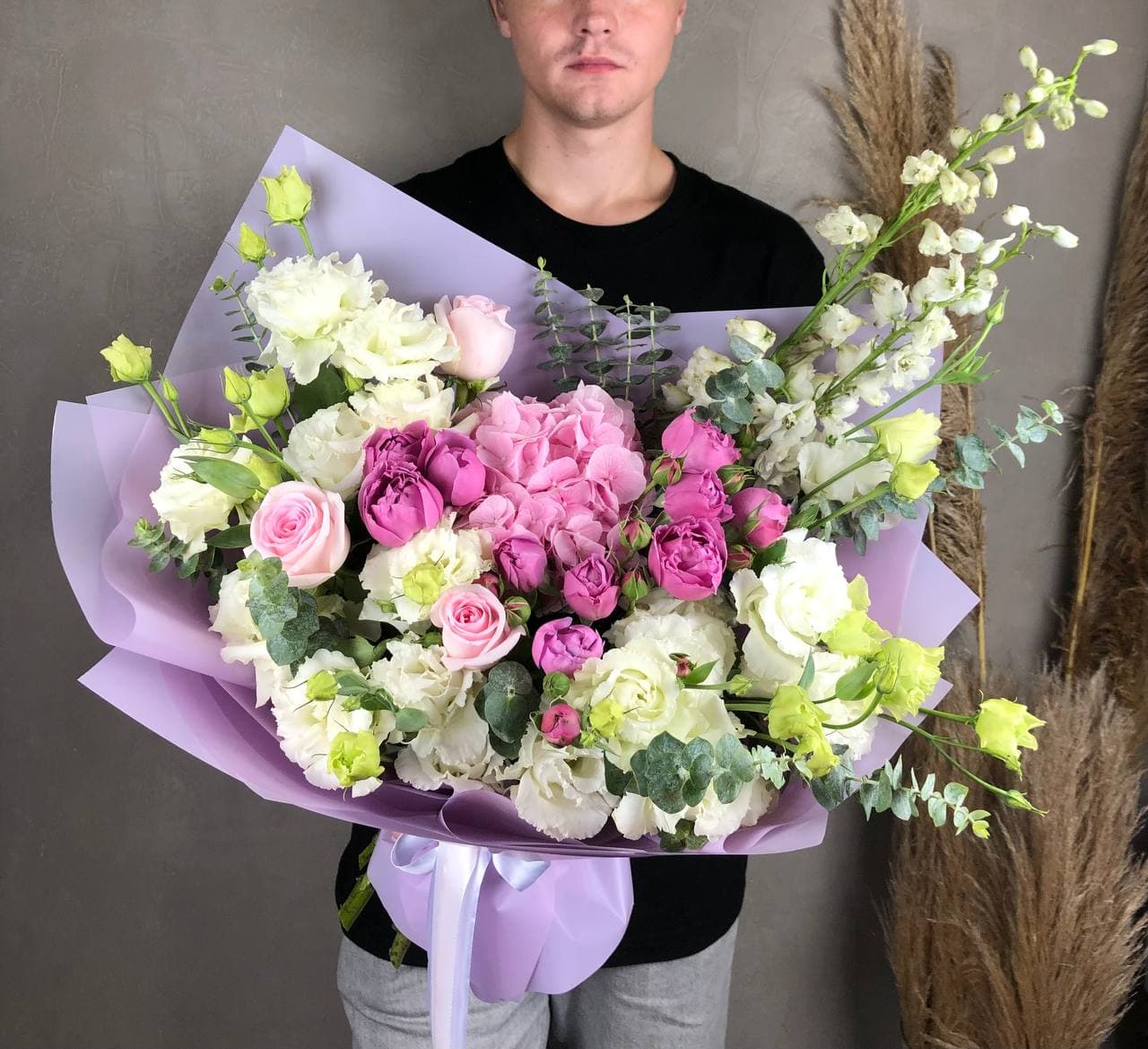 Воздушная композиция с крупными соцветиями гортензии и пышными розами создает ощущение легкости и объема. Эвкалипт добавляет свежести, а бомбастик расставляет яркие акценты между бутонами. Букет для тех, кто ценит естественную красоту и выразительность форм.