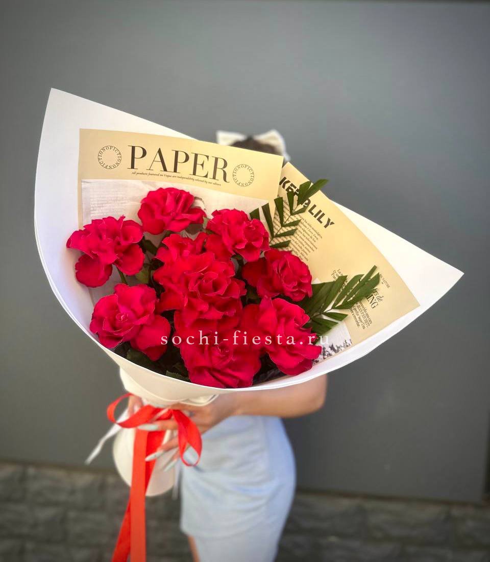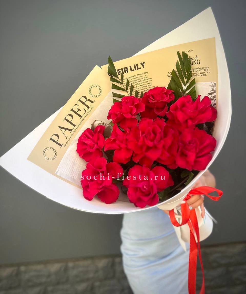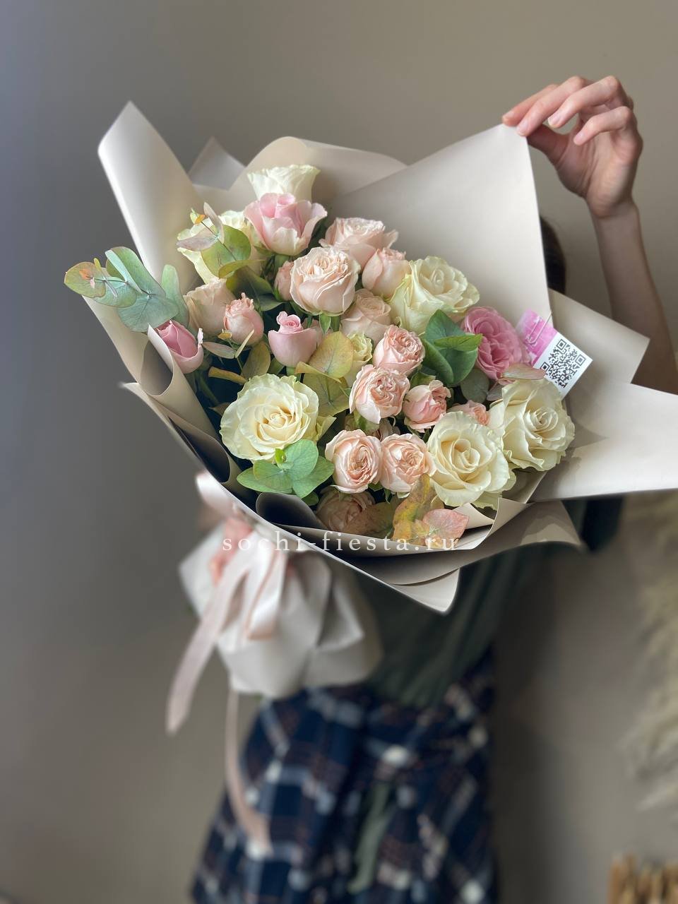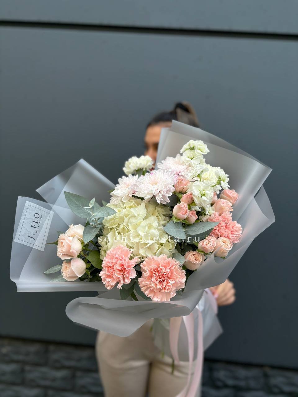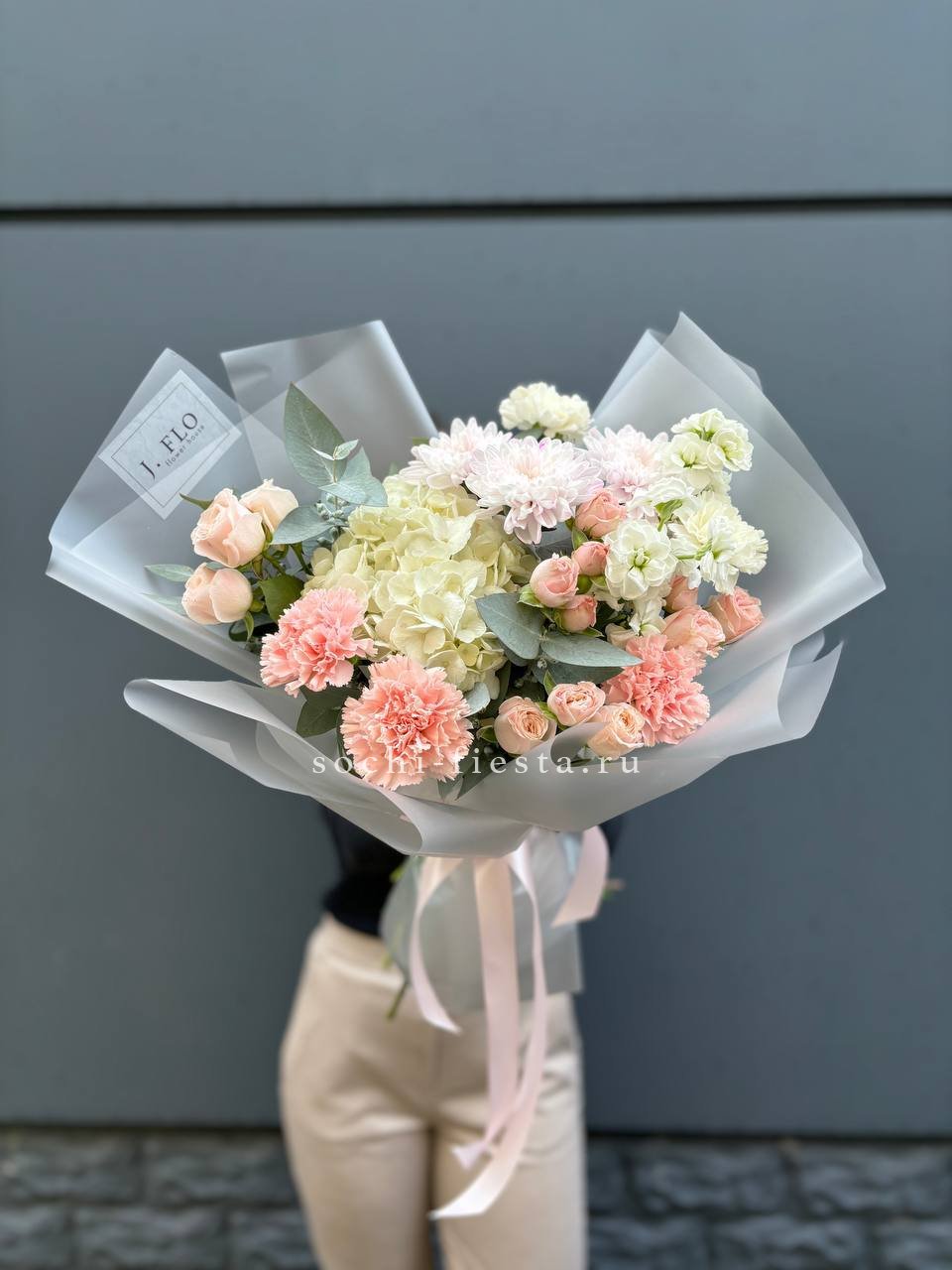 Воздушная композиция с крупными соцветиями гортензии и пышными розами создает ощущение легкости и объема. Эвкалипт добавляет свежести, а бомбастик расставляет яркие акценты между бутонами. Букет для тех, кто ценит естественную красоту и выразительность форм.