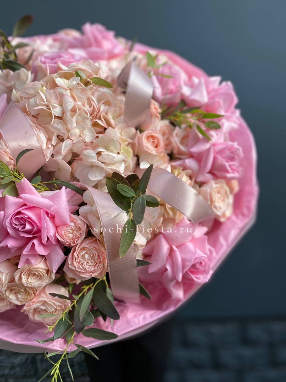 гортензии, бомбастик, розы, эвкалипт в воздушном оформлении.