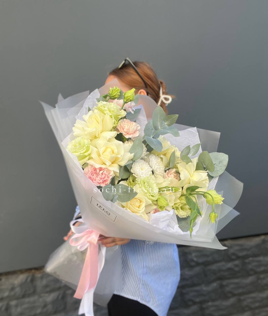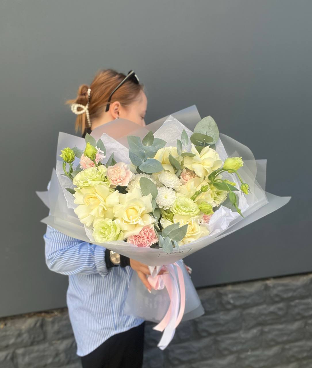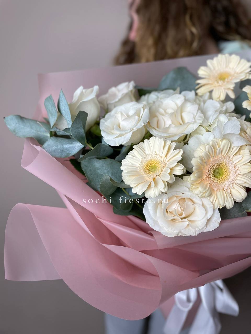 Герберы и розы встречаются с пышными соцветиями гортензии в теплой гамме заката. Sunset объединяет фактуры и оттенки в гармоничную композицию с зелеными акцентами эвкалипта.