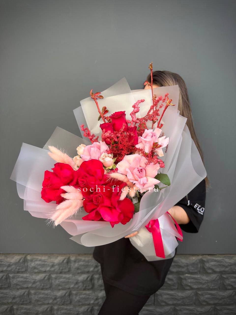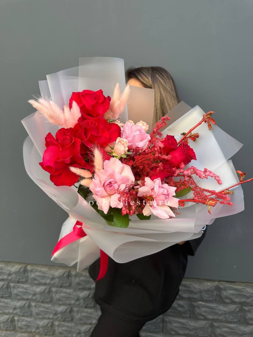 Мягкие пионовидные формы переплетаются с классическими розовыми бутонами в плотной округлой композиции. Эвкалипт освежает палитру и придаёт букету завершённость.