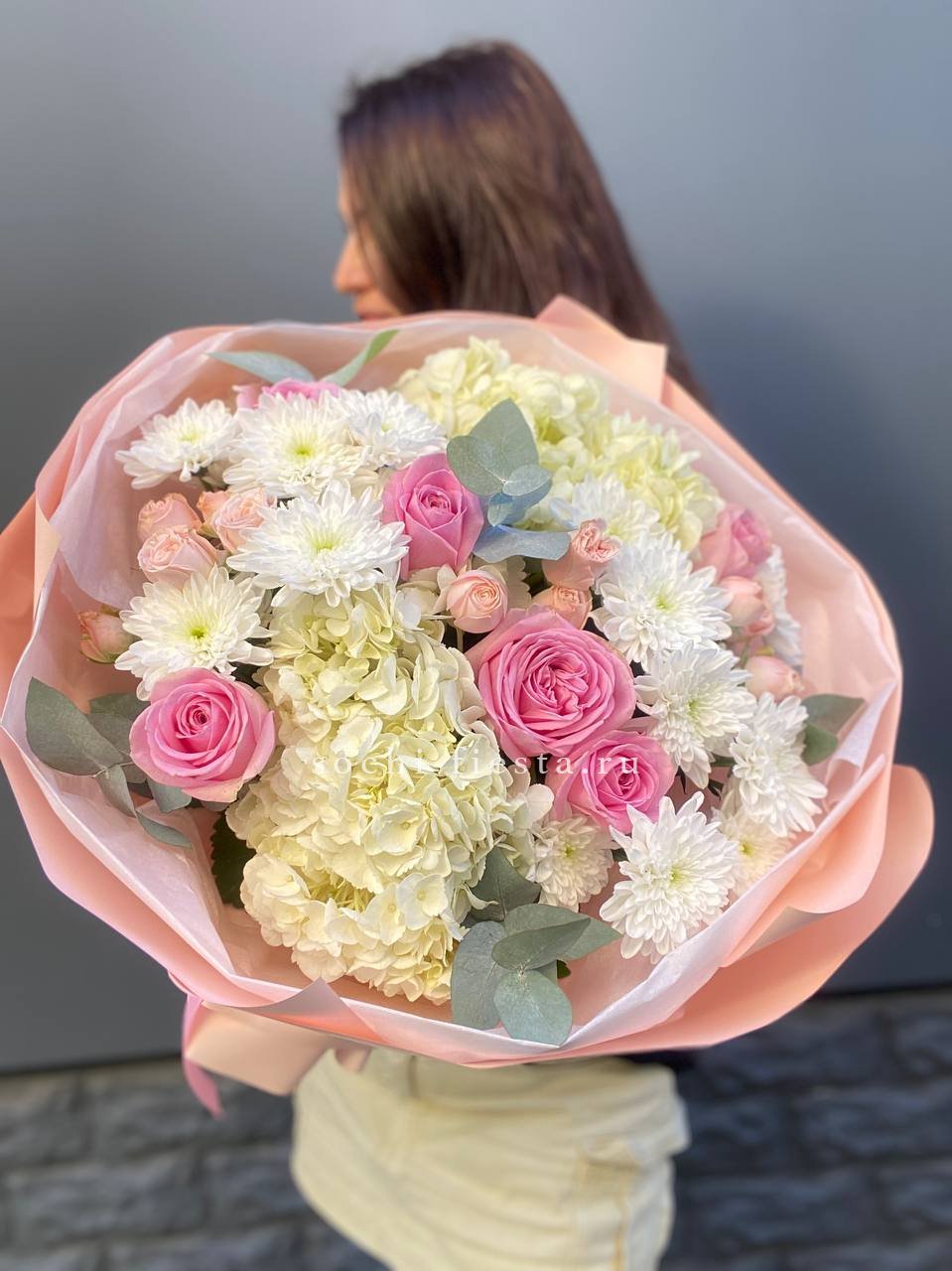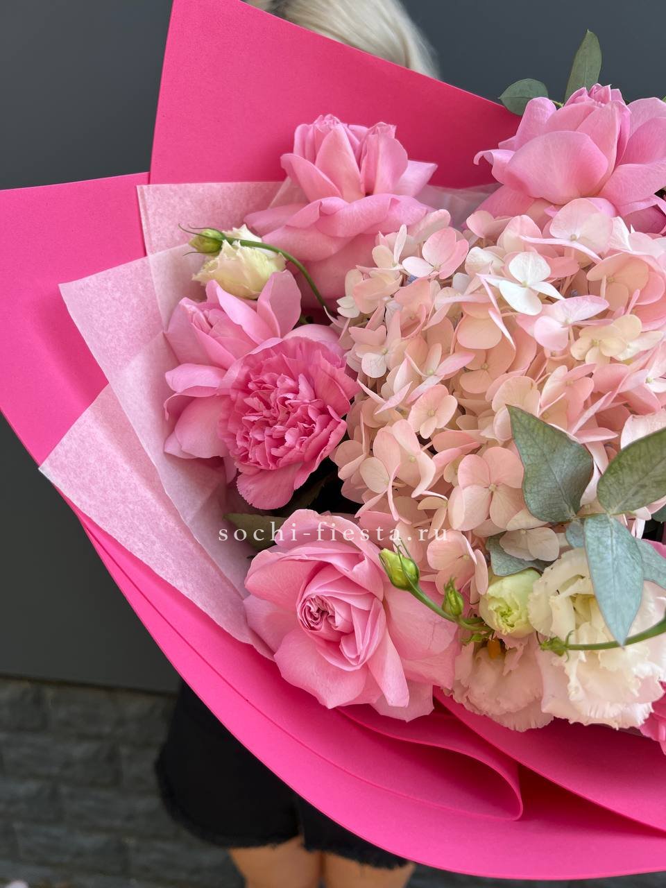 гортензия, пионовидная кустовая роза, розовая роза, хризантема, эвкалипт, лента, дизайнерская пленка.