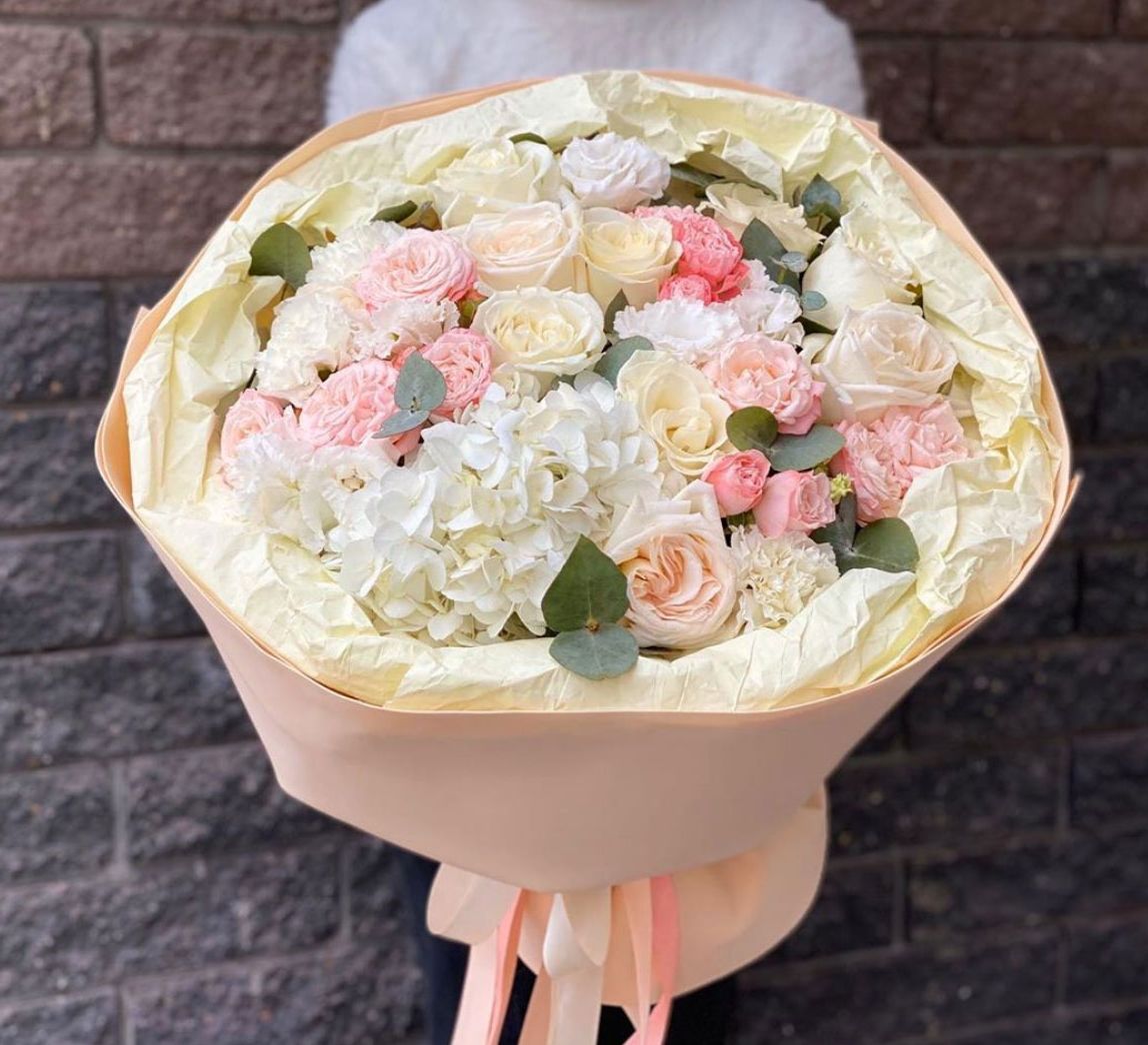 Пышная шапка гортензии уравновешивает вертикальные стрелы антиринума, а джумилия добавляет глубину бордовыми акцентами. Композиция построена на чередовании плотных соцветий и воздушных метёлок лимониума.