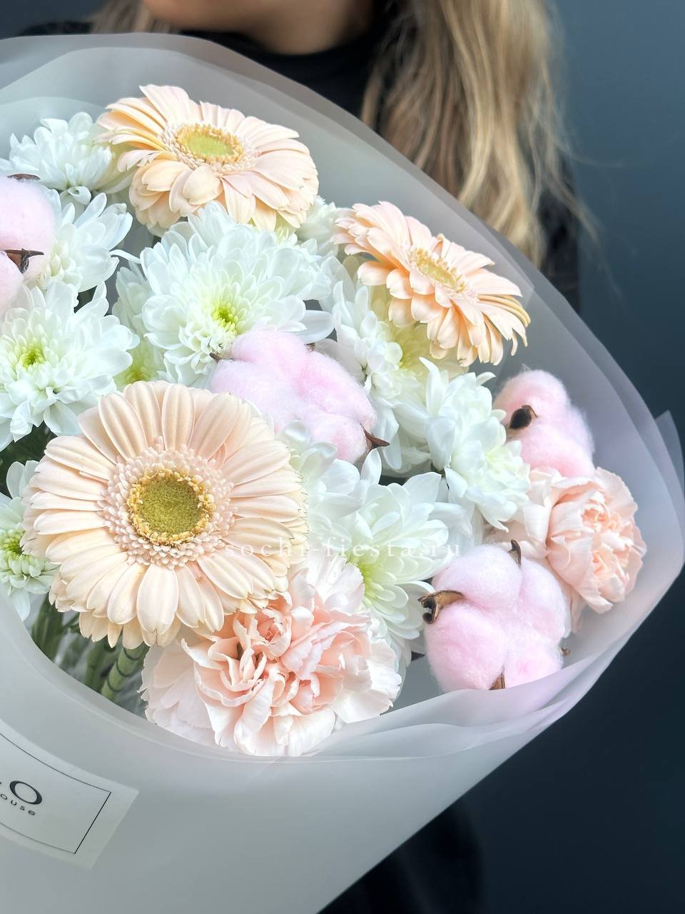 гортензия, гвоздика, статица (или аналог), роза, эустома, дизайнерская пленка, лента.