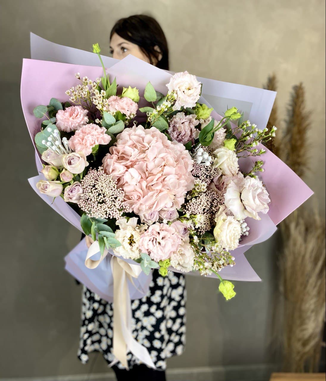 Фиолетовые оттенки переходят от насыщенной гортензии к лиловым бутонам роз и статицы. Гвоздика и эустома разбавляют глубину палитры светлыми акцентами.